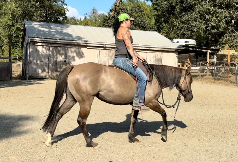 Has only been ridden in a hackamore but I am planning on switching her into snaffle by summer 2026. She is good to ride bareback and could possibly end up being a catch horse. However she does not stay on the trail and will wander if she is not made to stay in line. She is dull sided which adds to her wandering problem. Should be something we can train out of her with some work.